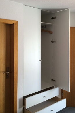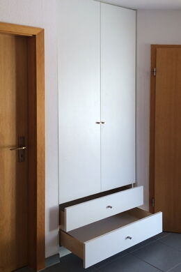 Einbauschrank aus Egger Span 19mm Dekor weiß Perl, mit Edelstahl Griffknöpfen, gedämpften Türbändern und Schubkästen in Nieschensituation.