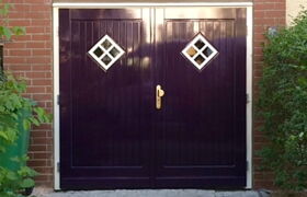 Herstellung und Montage eines auf Maß angefertigtem Garagentors aus Sibirischer Lärche.  Zweiflügliges auswärtsschlagendes Garagentor aus sib. Lärche, Füllung mit senkrechter Verbretterung.