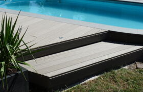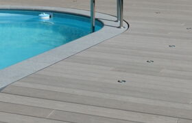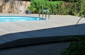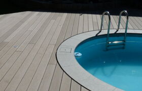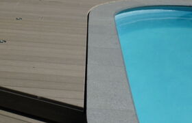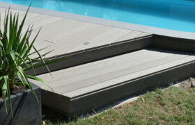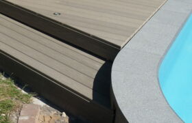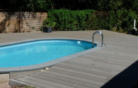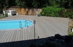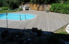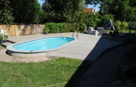 Hier haben wir eine 55m² Terrasse aus Fiberon-WPC-Terrassendielen um den bestehenden Pool herum gebaut. Die Fiberon-WPC-Terrassendielen sind sehr gut für den POOL-Bereich geeignet, da sie ein viel höheren Kunststoffanteil aufweisen, als die herkömmlichen Terrassendielen. Die Terrasse hat integrierte Leuchten.